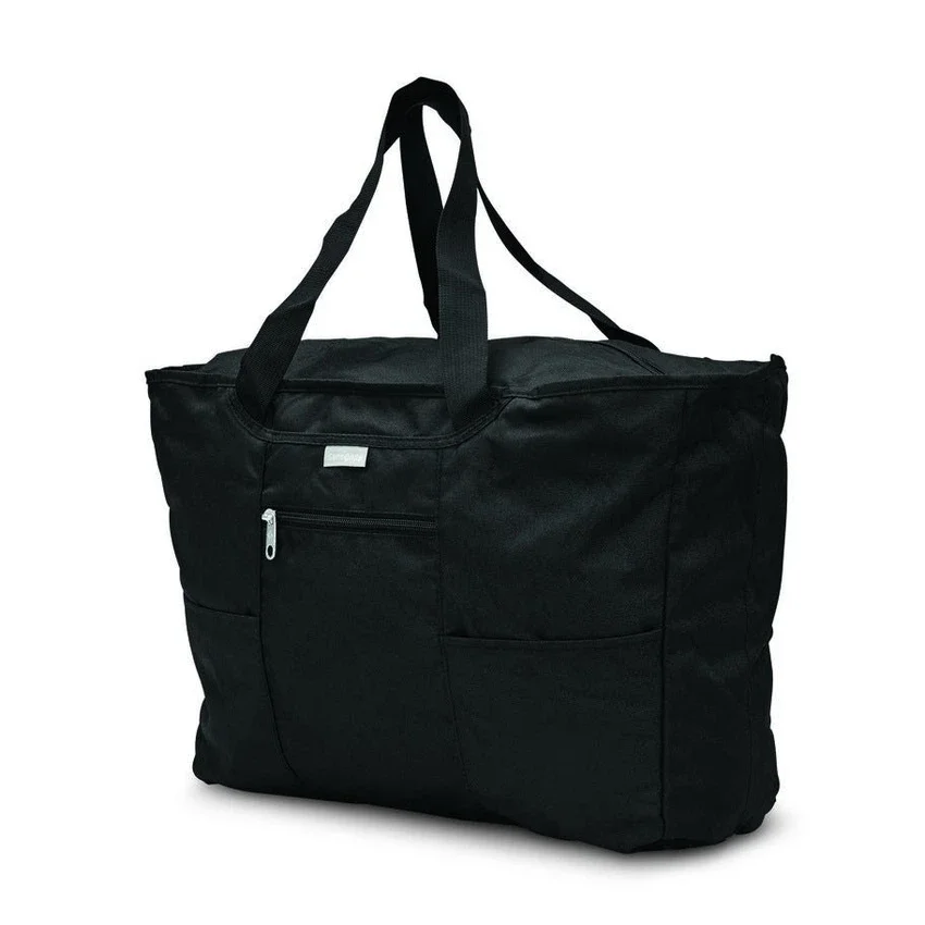 constructed of 600d nylon poly with pu backing, the foldaway tote folds into an integrated pouch with loop. features a zippered main opening, 2 slip pockets, 1 zip pocket, interior pouch, and oversized shoulder straps.