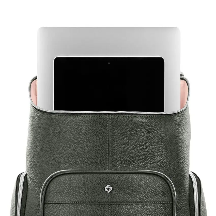 the deluxe leather backpack features padded laptop and tablet sleeves, a spacious front pocket, two side zippered pockets for your water bottle or umbrella, and comfortable shoulder straps. the built-in stackit™ strap adds ease to your commuting and travel.