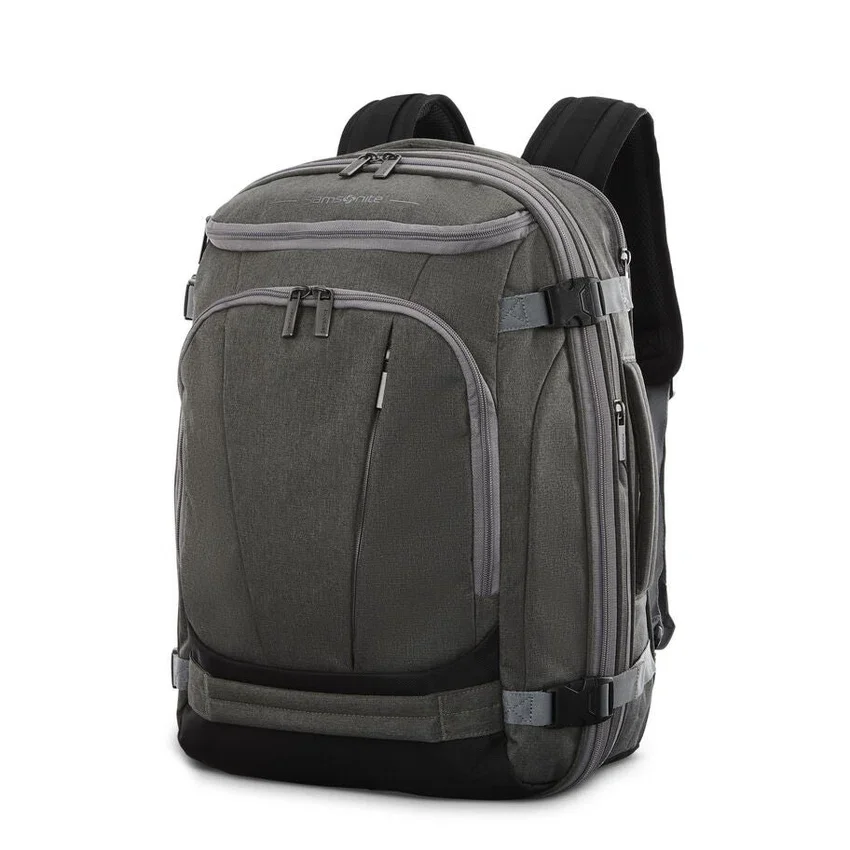 this backpack has tons of pockets strategically placed inside and out so everything has its place. not only is it easy to organize, but its expandable with external compression straps so you can still fit your favorite backpack in the overhead bin.