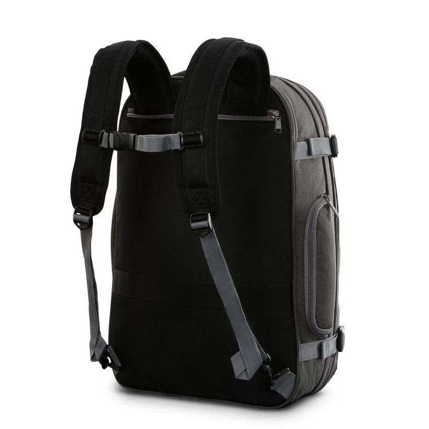 this backpack has tons of pockets strategically placed inside and out so everything has its place. not only is it easy to organize, but its expandable with external compression straps so you can still fit your favorite backpack in the overhead bin.