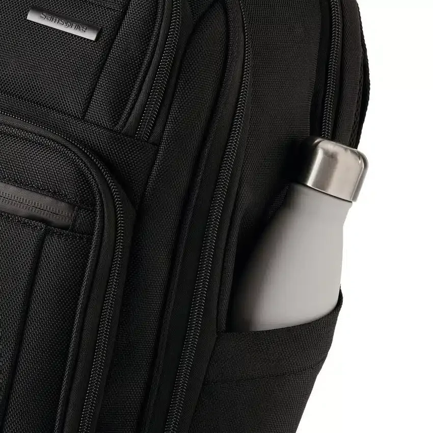 bottom front pocket includes organization; key fob, multiple slip pockets, a zippered mesh pocket, and 2 pen sleeves.