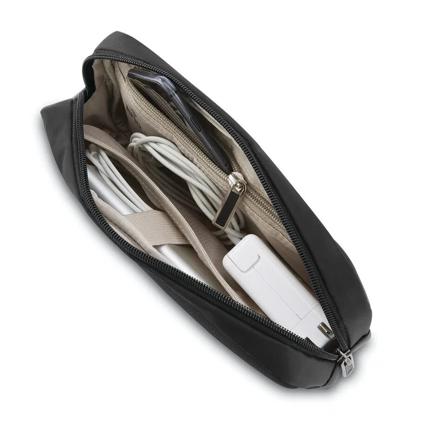 - removable pouch, ideal to store tech accessories; features an rfid lined pocket & wireless charging capabilities