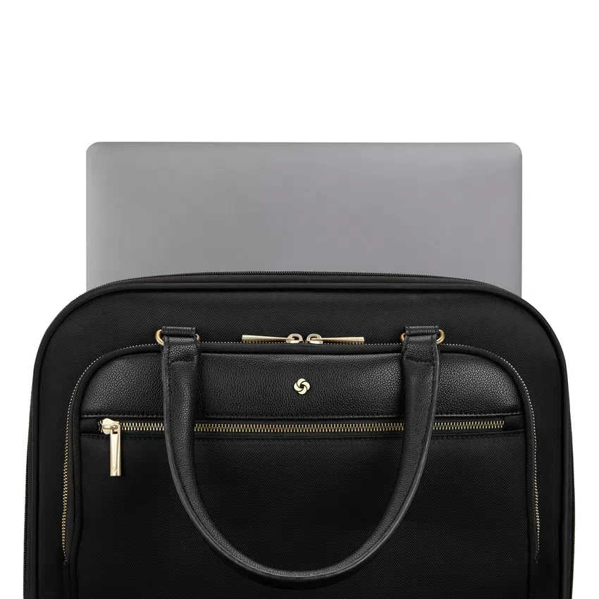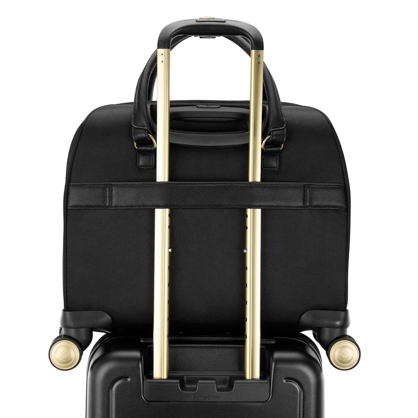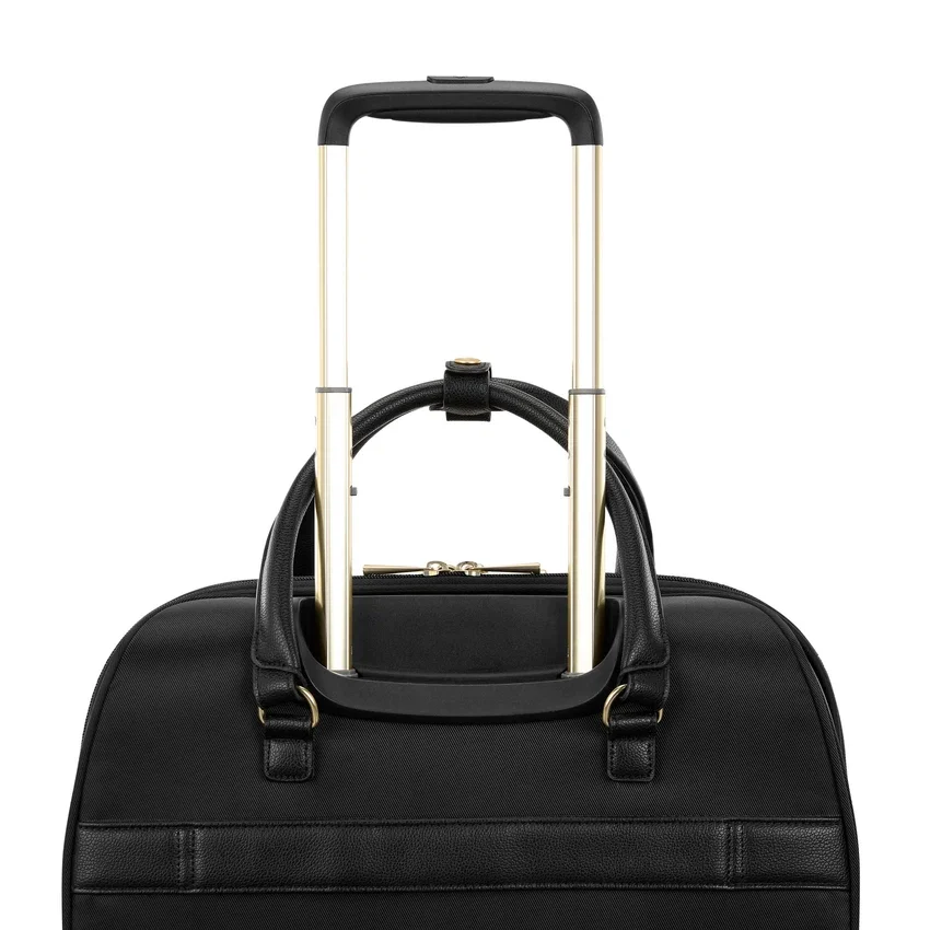 the spinner mobile office is your office on the go—compact and organized with a padded laptop sleeve, file pockets, compression straps, and exterior zippered pockets with usb passthrough. finished with champagne hardware and smooth wheels, it features a stackit™ strap for hands-free luggage attachment.