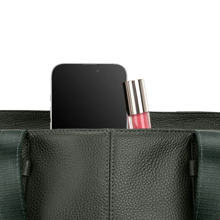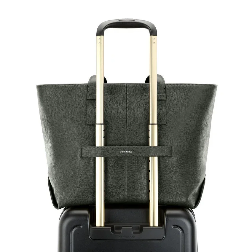 inside the leather tote, you will find a padded laptop sleeve, an interior water bottle holder, and organizational sleeves. a discreet stackit™ strap on the back ensures effortless travel, whether you’re headed to the office or escaping for a weekend getaway.