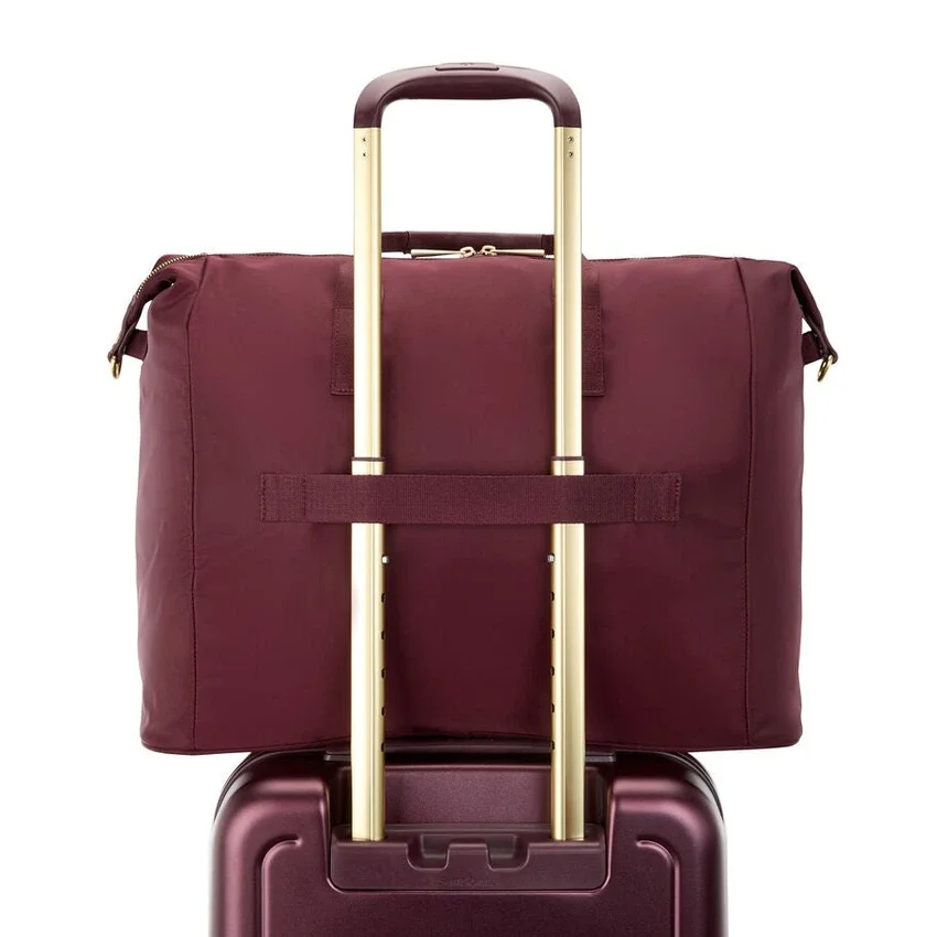 the duffel features a padded laptop sleeve, interior and front zippered pockets with organizers, a removable shoulder strap, and a stackit™ strap to attach to your luggage with ease.