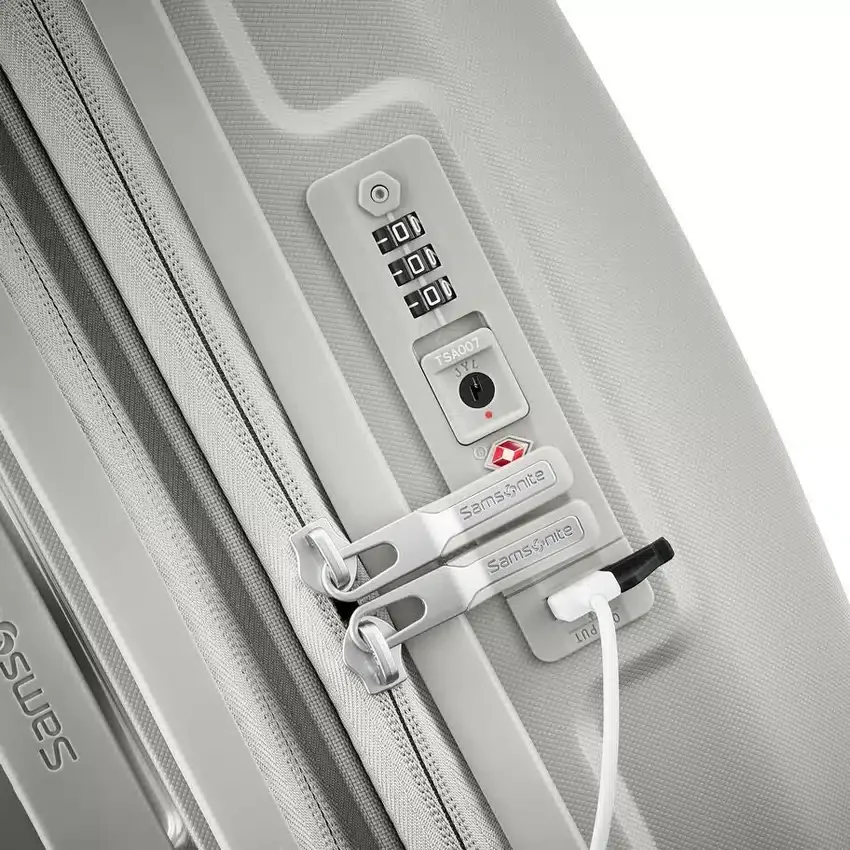 built-in tsa lock with an integrated usb port (carry-on sizes only) and internal battery pocket