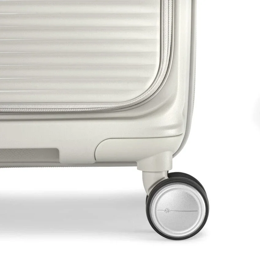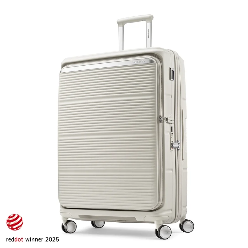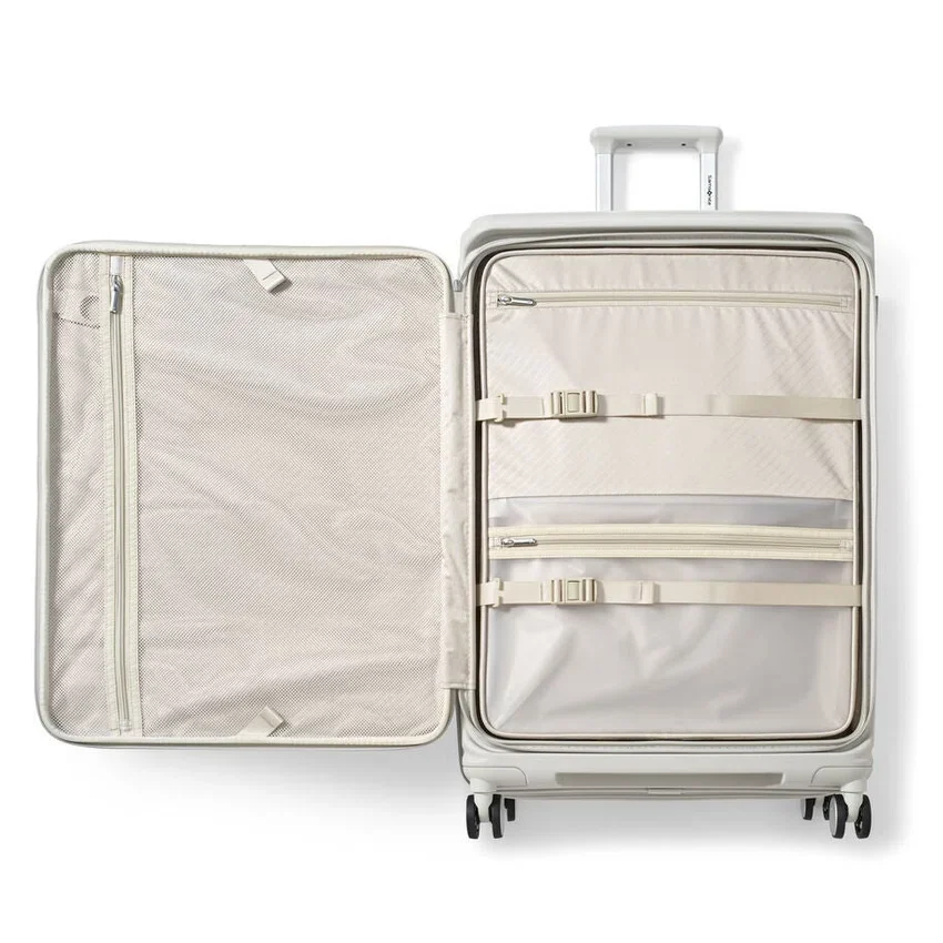 made from ultra-durable and sustainable materials, the large spinner opens from the middle, like traditional luggage, and provides a second front door opening that allows you to fully pack and unpack when floor space is limited.