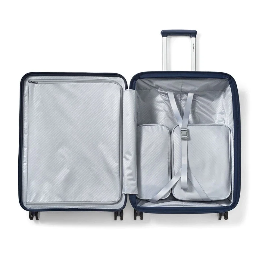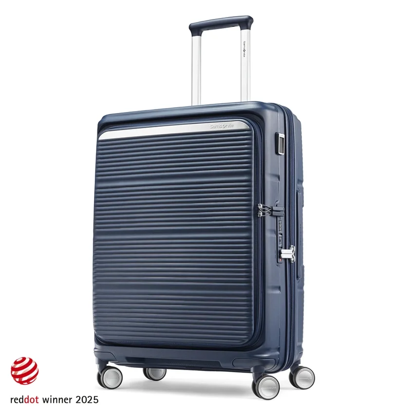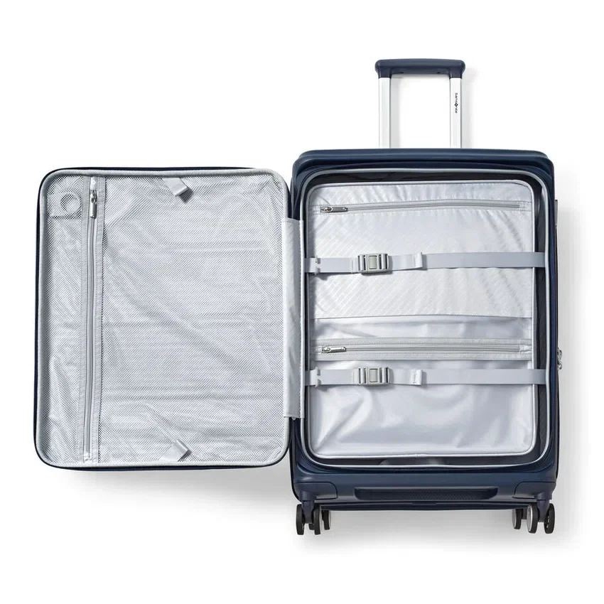 made from ultra-durable and sustainable materials, the medium spinner opens from the middle, like traditional luggage, and provides a second front door opening that allows you to fully pack and unpack when floor space is limited.