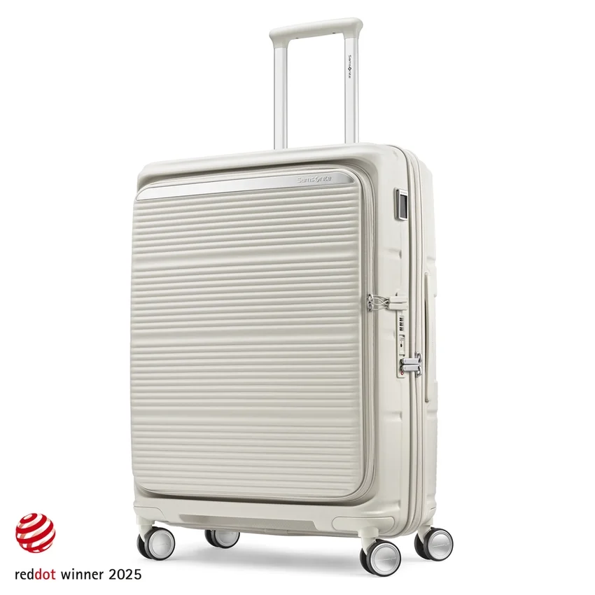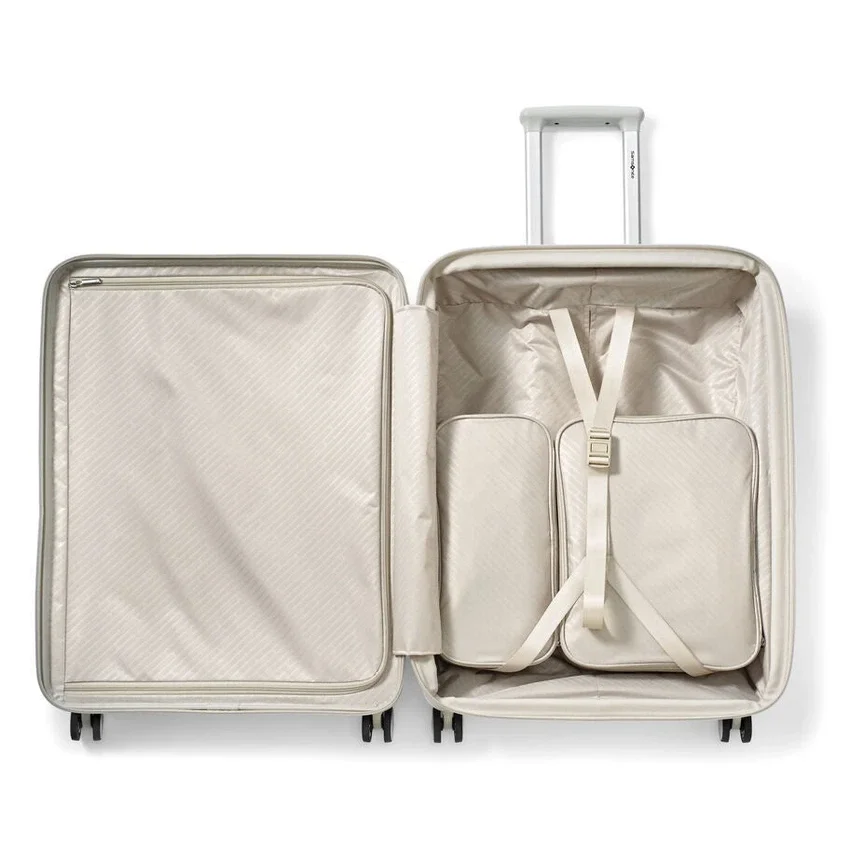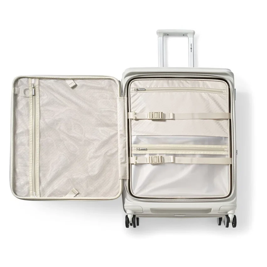 made from ultra-durable and sustainable materials, the medium spinner opens from the middle, like traditional luggage, and provides a second front door opening that allows you to fully pack and unpack when floor space is limited.