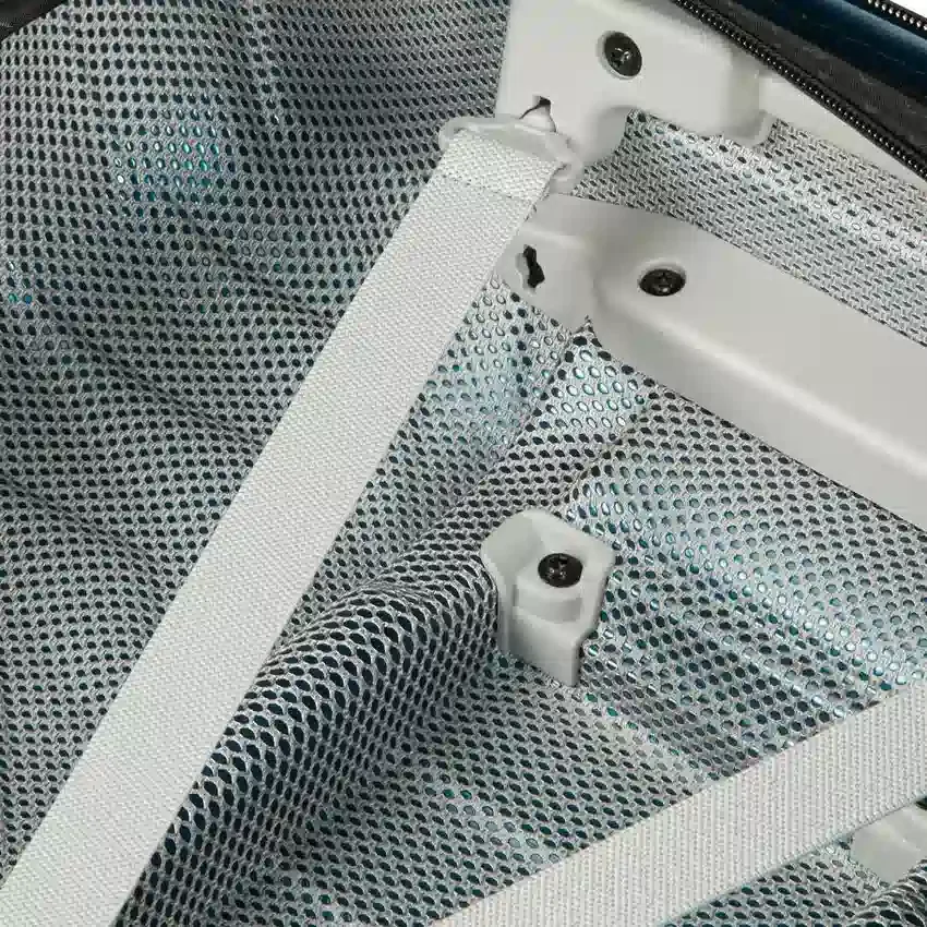 the two divider pads, large pocket and removable, in-height adjustable cross ribbons ensure you can pack and compress your belonging carefully.