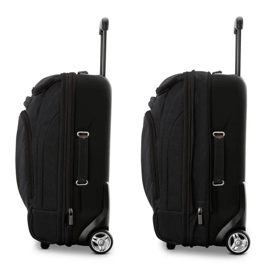 the mother lode carry-on rolling duffel is where hardside meets softside luggage. with a molded backside for supreme durability coupled with organization, this duffel is perfect for a weekend getaway or an extended trip out of town.