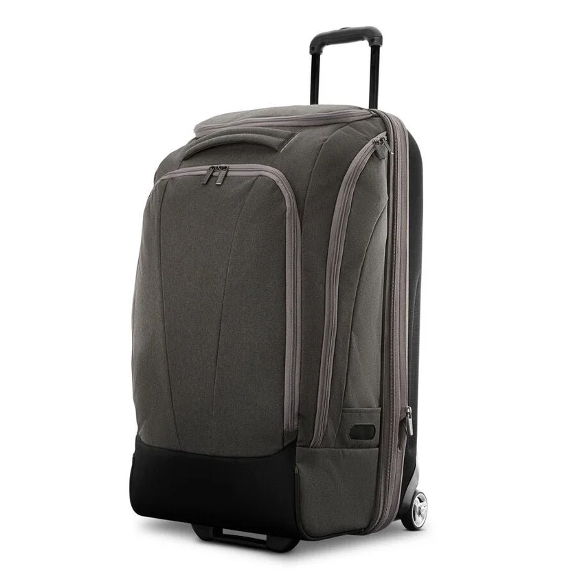 the mother lode large checked rolling duffel is where hardside meets softside luggage. with a molded backside for supreme durability coupled with organization, this duffel is perfect for a weekend getaway or an extended trip out of town.
